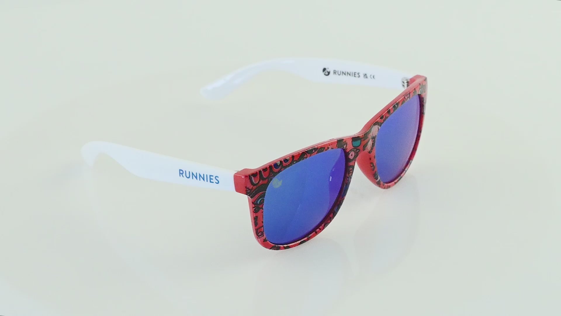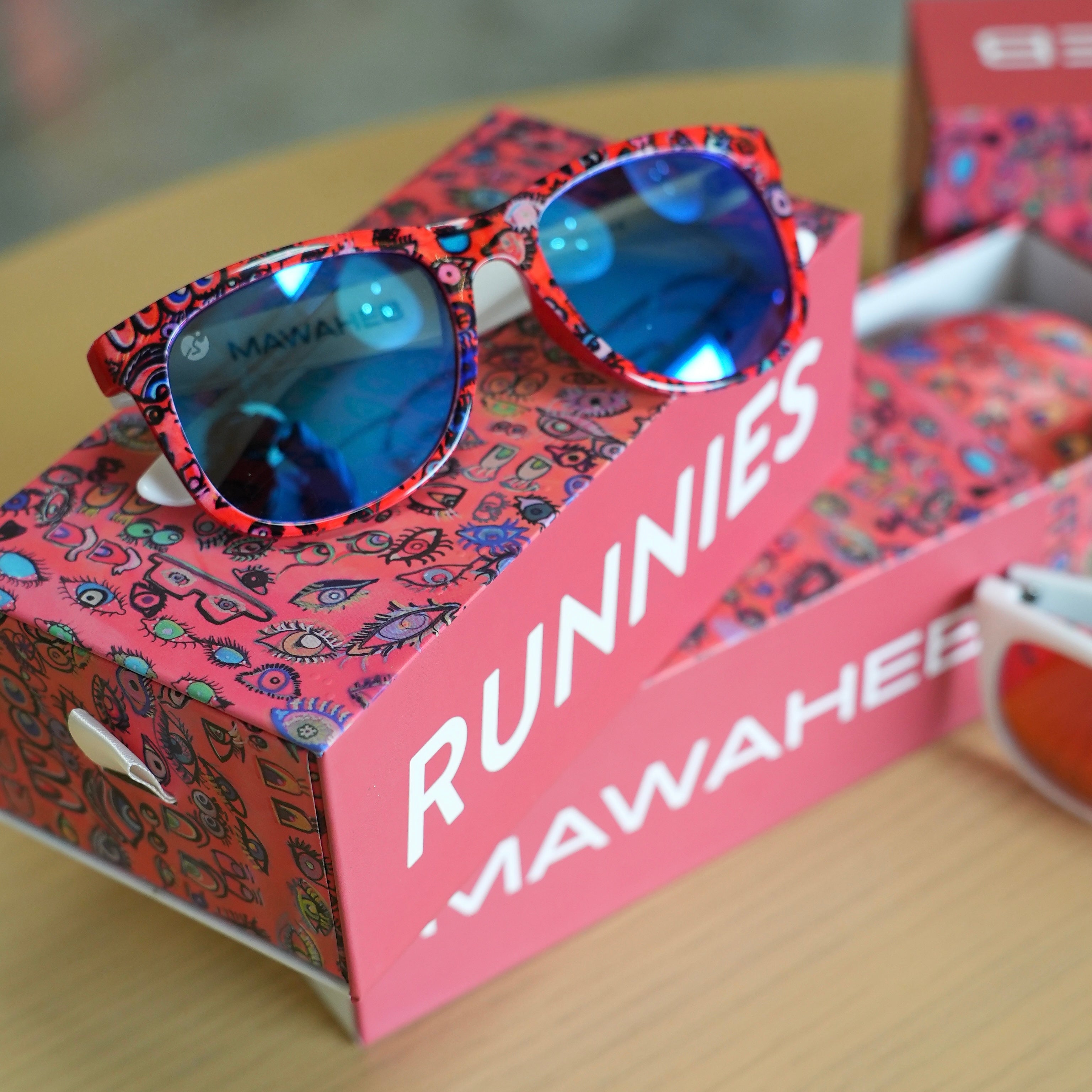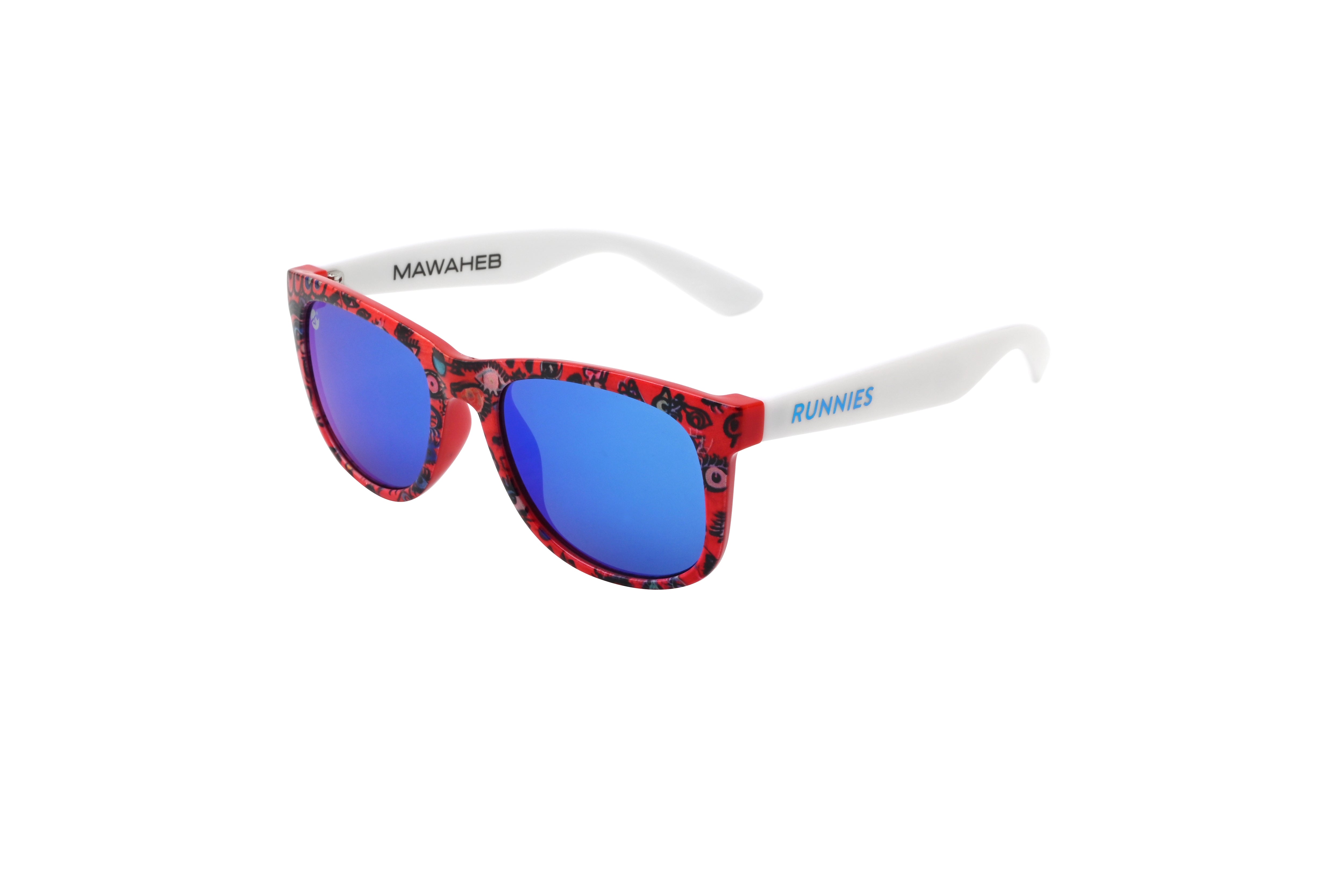 Available in Blue and Red editions, each with the same intricate eye pattern but different lens treatments. One arm says "MAWAHEB" - the other says "RUNNIES." Because this is about both of us.